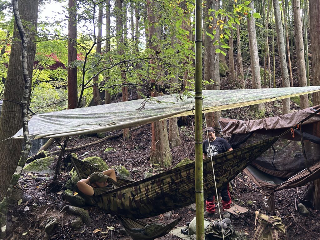 法面を下った先に広がる観音沢に面するワイルドな野営エリア。岩場や水辺はクローラーRCの走行に最適です。