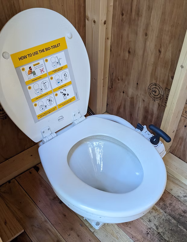 手動で流すタイプの水洗トイレです。右側の黒いレバーを上下させると水が流れます。紙は流せませんのでバケツに入れるようお願いいたします。