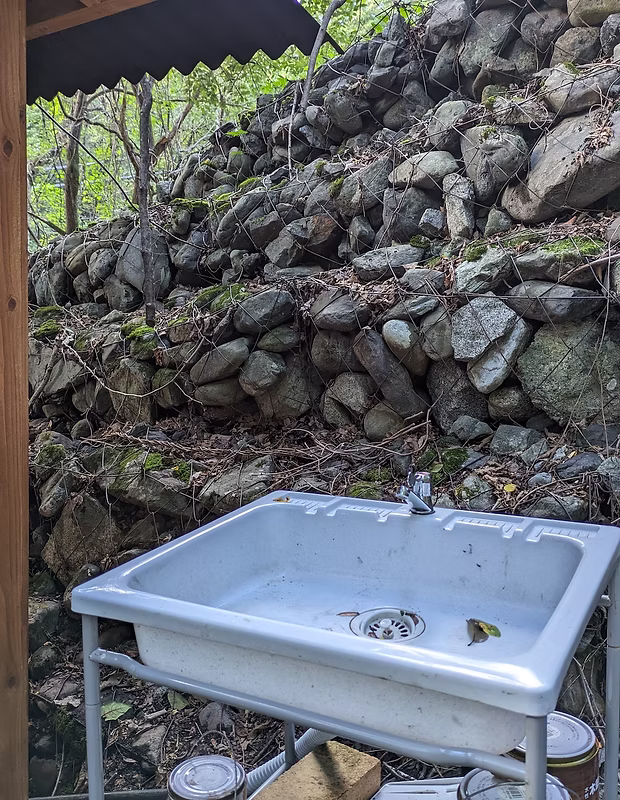 小さい流しが一つしかありませんので譲り合ってご利用をお願いします。沢から取水した天然水がご利用いただけます。飲用される場合は必ず沸かしてからご使用ください。